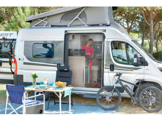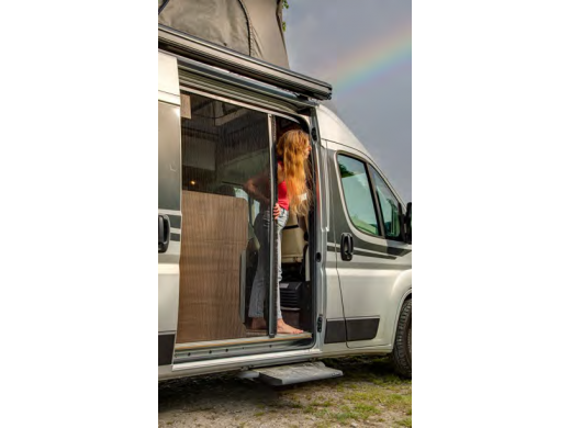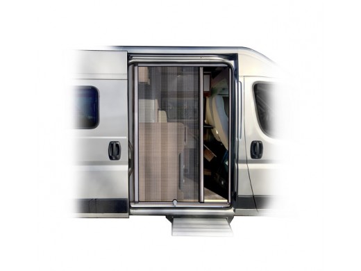 • plisowana, aluminiowa moskitiera furgonetki z niską prowadnicą w kształcie litery L, po której można chodzić,