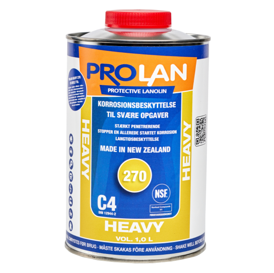 - Prolan Heavy 270 1 l to specjalistyczny środek do ochrony w klasie C4 – idealny dla maszyn budowlanych, sprzętu morskiego i pojazdów ciężkich. Naturalna lanolina zapewnia głęboką penetrację i długotrwałą hydrofobową barierę, zastępując tradycyjne bitumy i oleje wiertnicze.