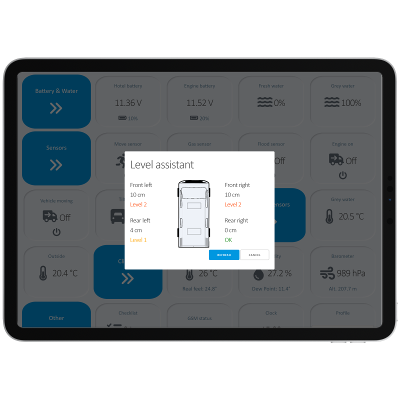 • Integracja niezbędnych urządzeń pokładowych a więc załączanie i wyłączanie  takich elementów wyposażenia jak: ogrzewanie postojowe, oświetlenie, lodówka, pompy wody,  przetwornice napięcia, ładowarki,  elektrozawory, wiatraki dachowe, syreny alarmowe, dowolne inne urządzenia na 12V